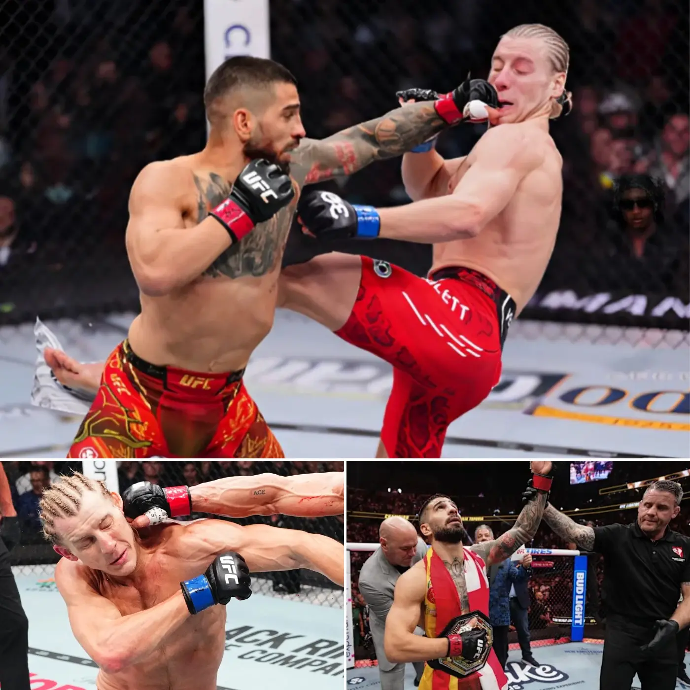 The punch landed with frightening precision. Pimblett’s chin snapped sideways, his body locked in midair, and his knees buckled before he collapsed face-first onto the canvas. For a heartbeat, the arena went silent. Thousands of voices, millions of expectations, all drowned in a single moment of awe. Ilia Topuria didn’t celebrate — he simply stood there, calm and still, as the referee waved off the fight.